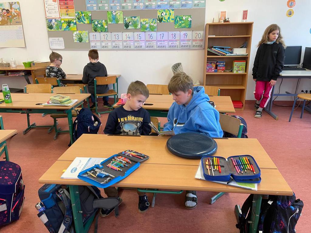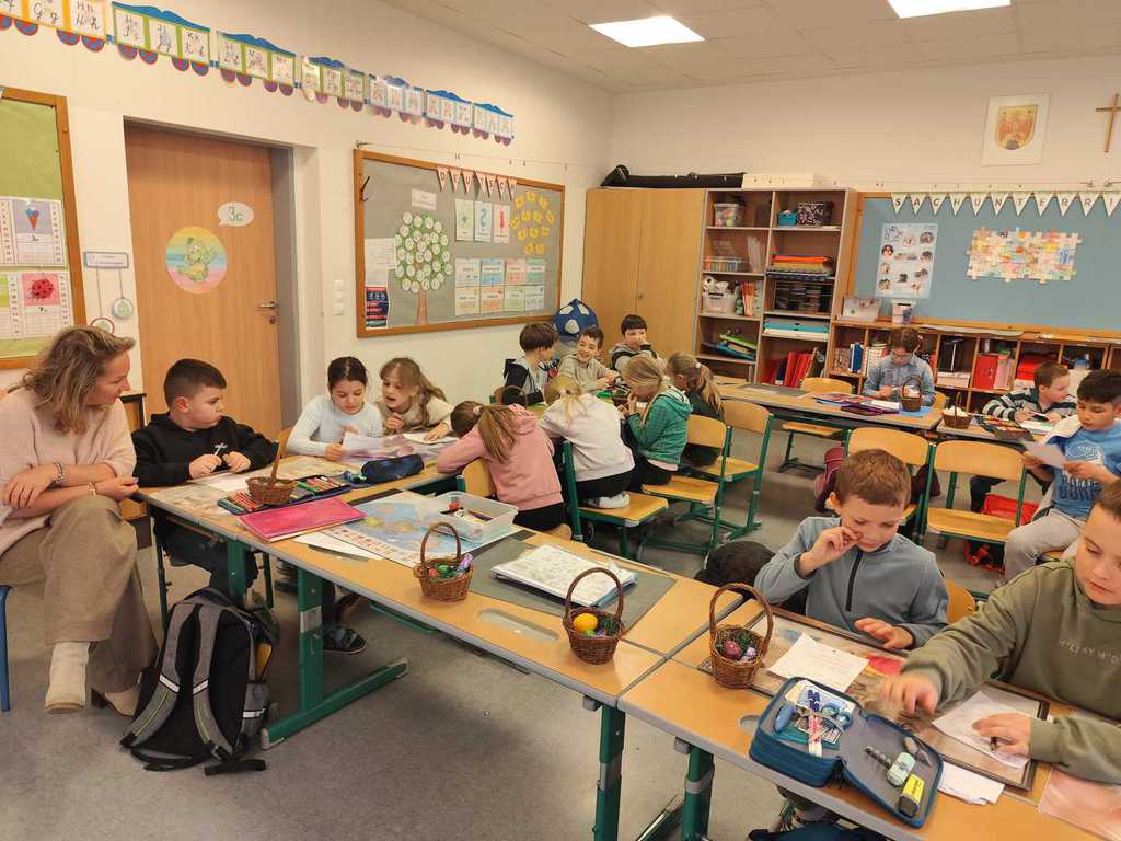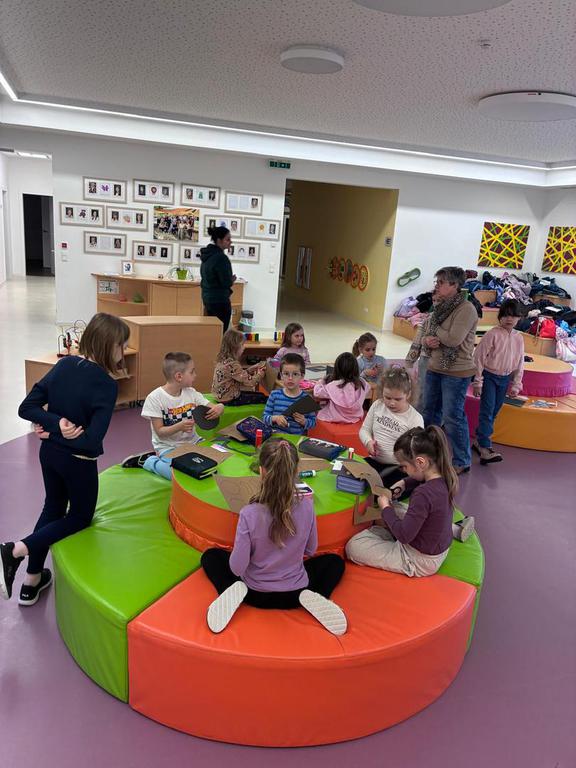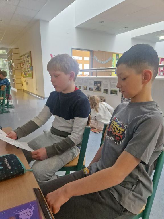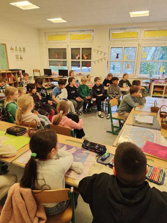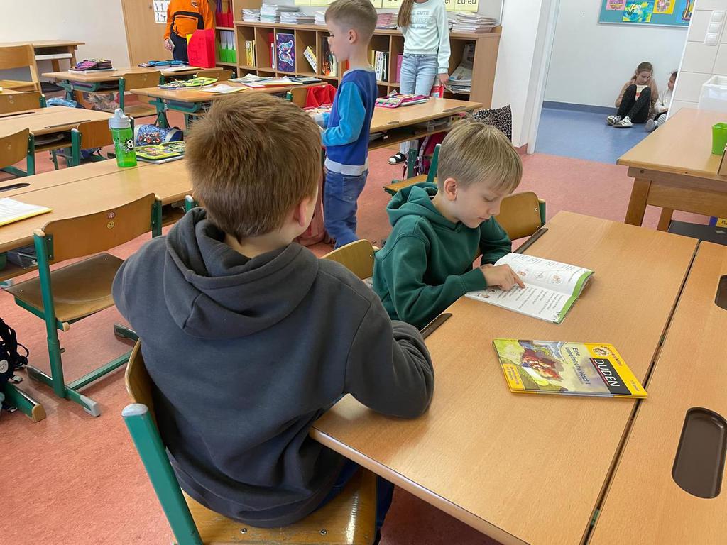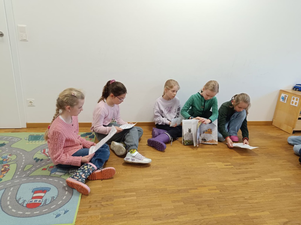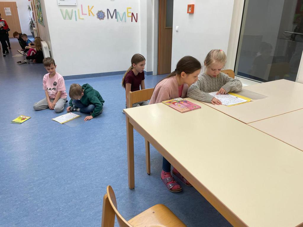 Eine Klasse nutzte den Vorlesetag für einen Besuch in der Gemeindebibliothek. Dort erwarteten die Kinder liebevoll vorbereitete Stationen rund ums Lesen und Entdecken.